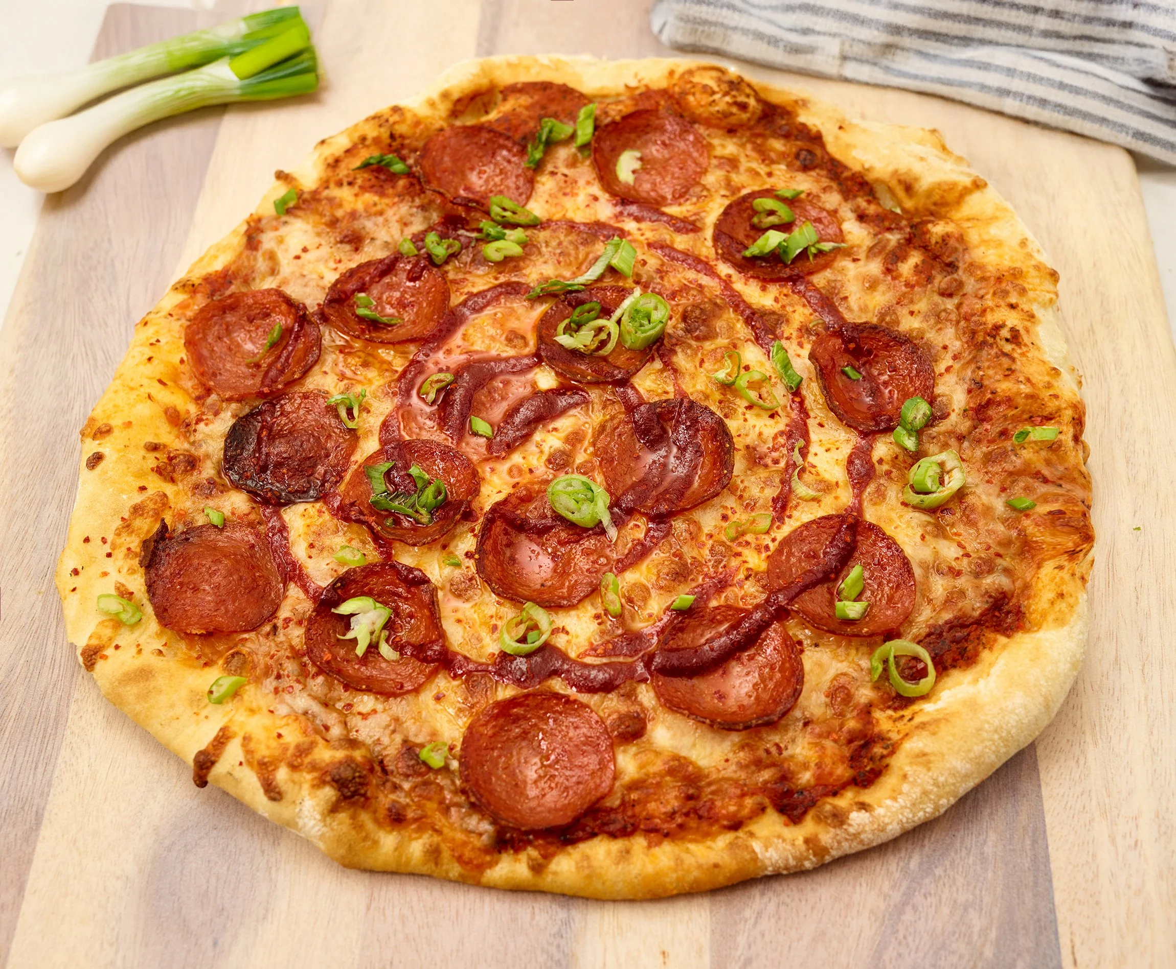 Pepperoni Pizza with Gochujang sauce and Scallion for a spicy Korean twist.